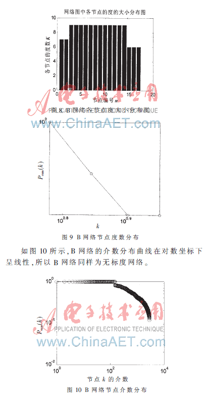 由表2及图8可以看出B网络在网络拓扑参数方面平均度比较高,高度数节点相对集中,所以故障传播速度也比较快。对照图6、图7可知其度数较大元件为功率开关器件。图9说明B网络的度分布在对数坐标系中对应于一条直线,符合幂律分布。