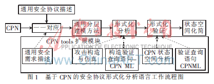 基于CPN的安全协议形式化分析语言工作流程图如图1所示。