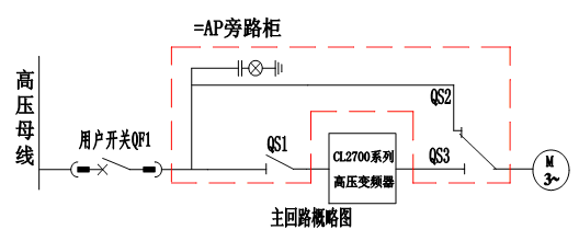 根据现场的实际情况,旁路柜采用一拖一手动方案,此结构是手动旁路的典型方案,是由3个高压隔离刀闸QS1QS2QS3组成,其中QF1为客户提供高压隔离总开关,