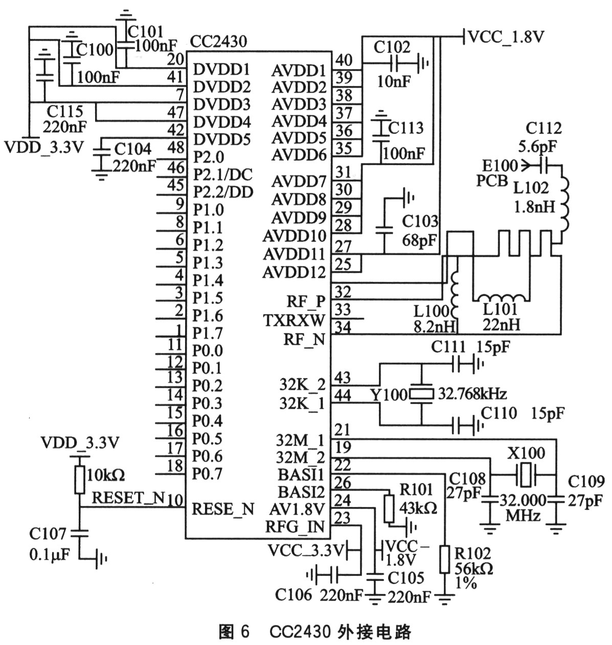 CC2430芯片延用了以往CC2420芯片的架构,在单个芯片上整合了ZigBee射频(RF)前端、内存和微控制器。它使用1个8位MCU(8051),具有128 KB可编程闪存和8 KB的RAM,还包含模拟数字转换器(ADC)、几个定时器(timer)、AES128协同处理器、看门狗定时器(watchdogtimer)、32 kHz晶振的休眠模式定时器、上电复位电路(power on reset)、掉电检测电路(brown out detection),以及21个可编程I/O引脚。CC2430芯片采用0.18 μmCMOS工艺生产;在接收和发射模式下,电流损耗分别低于27 mA或25 mA。CC2430的休眠模式和转换到主动模式的超短时间的特性,特别适合那些要求电池寿命非常长的应用。