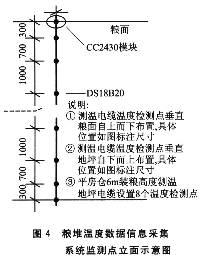 平房仓粮堆温度数据信息采集系统监测点立面示意图如图4所示。粮堆温度监测点分别由粮面向下和由仓底向上布置,按照6m装粮高度每根单总线电缆设置8只温度传感器,自粮面向下及自仓底向上传感器布置间距为0.30 m、0.70 m、1.0 m、1.0 m。对仓内东、南、西、北各侧3组同一平面的3个粮堆温度监测点的数据信息采取求平均值的方法进行整理,以提高监测数据信息的可靠性和准确性。