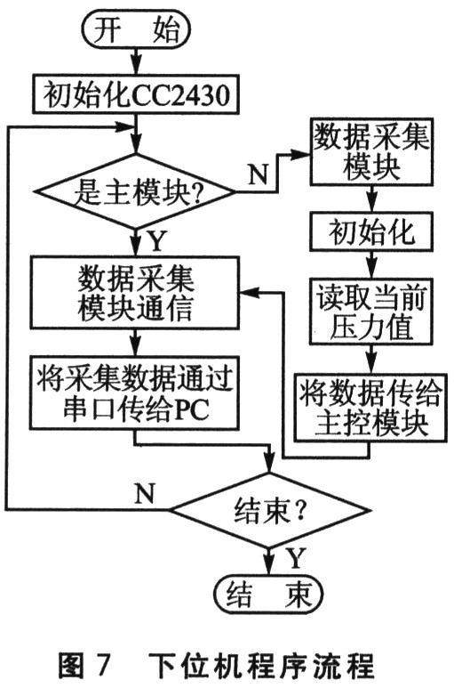在网络中,每个节点都有一个固定的地址。连接于监控主机的传感器节点是一个特殊的节点,它采用串行接口与监控主机通信。数据的传送采用主从站方式,与监控主机连接的节点作为主站,控制网络内的通信时序;其他节点作为从站,可以被主站寻址。主节点主要完成采集各从节点数据,进行预处理;从节点主要完成各种传感器原始数据的采集工作,如图7所示。