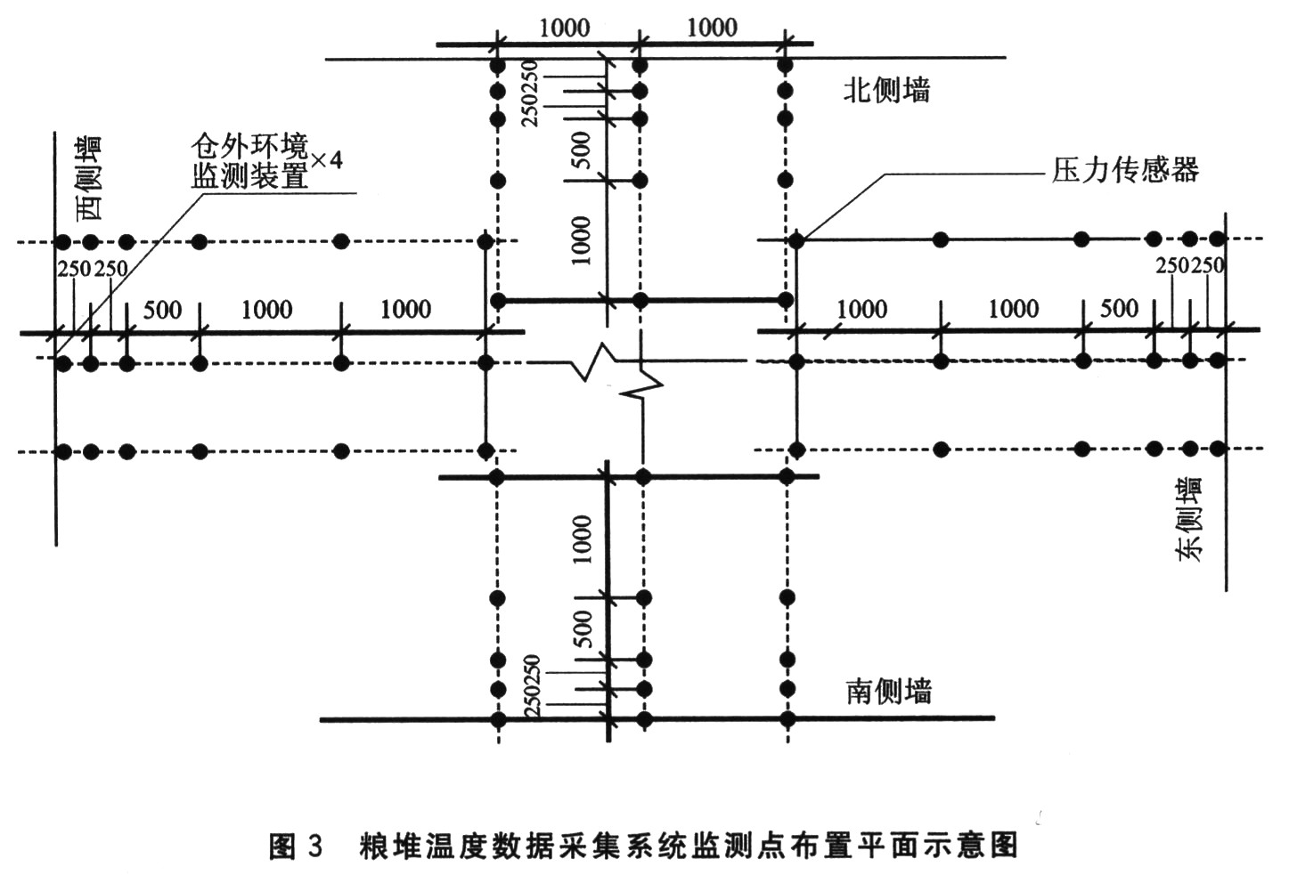 平房仓粮堆温度数据信息采集系统监测点布置平面示意图如图3所示。仓内温度传感器的设定是相对东、南、西、北侧墙向内每侧各布置3组温度传感器,其中每组间距为1 m;东、南、西、北各侧由墙向内布置的间距分别是0.25 m、0.25 m、0.5 m、1.0 m、1.0 m……。