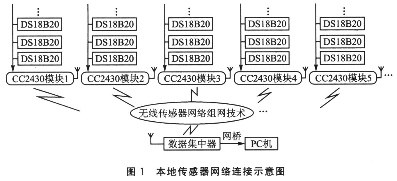 本系统主要结构是每个CC2430模块挂接多个DS18820温度传感器。温度传感器按一定规律布置在粮库中,通过单总线与当前CC2430模块连接;利用无线传感器网络组网技术将这些CC2430模块组网,并把数据发送到本仓数据集中器,通过网桥将数据集中器与当地监控主机连接,如图1所示。最后通过Internet将远程终端用户与当地监测系统连接,实现远程网络化粮库数量监控,如图2所示。