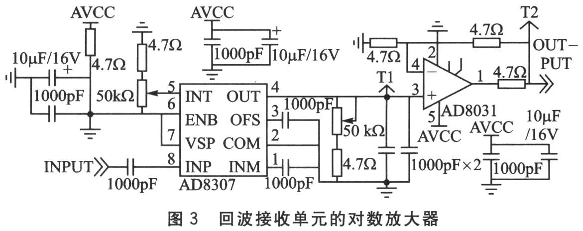 如图3所示,该方案采用单端输入,有对数零点和斜率调节电路,将对数零点设在-84 dBm,斜率定为大约20 mV/dB。对数放大器后加一级缓冲(AD8031),主要作用有二:一是使接收模块最终输出是低阻抗的,提高抗干扰能力;二是通过这一级的电压增益将对数斜率恢复到25 mV/dB 。设计的对数放大器信号输入范围定为-72 dBm(在50 Ω源阻抗时,-72 dBm相当于振幅为±80 μV的正弦波)到+10 dBm(振幅为±1 V的正弦波),相应的对数输出电压为0.3~2.35 V,对数动态范围82 dB 。该电路做成模块形式,封装在屏蔽罩中。所有引线(地线和输出信号线除外)均通过穿心电容引出,穿心电容的外极接地,以提高屏蔽效果。