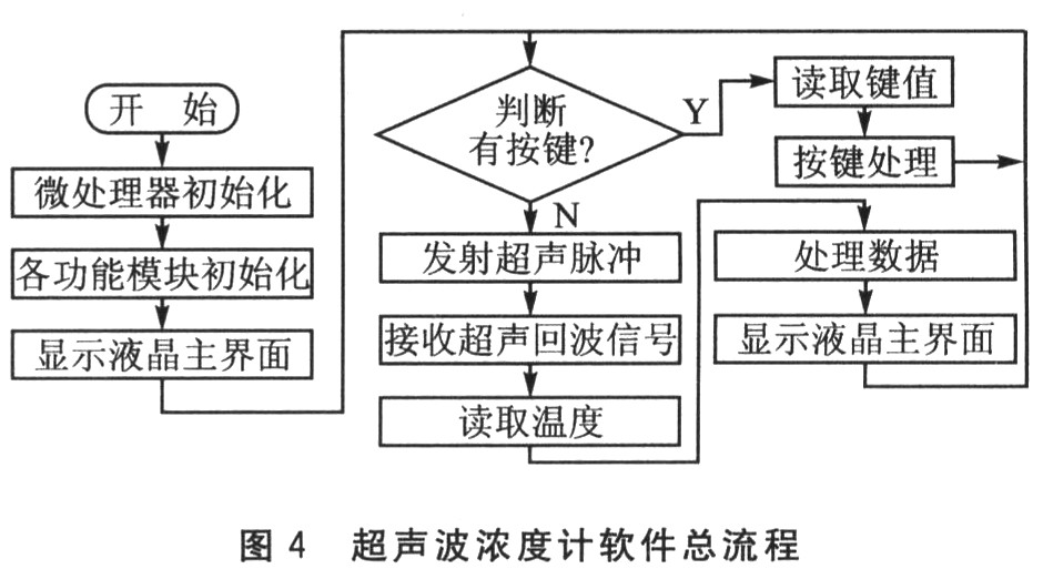 超声波浓度计软件由信号处理程序、界面程序、控制信号输出程序、通信程序四部分组成,软件总流程如图4所示。信号处理程序实现DDS控制、超声波发射、回波信号A/D采集、信号综合处理等功能,是软件程序的重点。界面程序包括界面显示、参数设置、键盘处理等功能,实现与用户良好的沟通。控制信号输出程序实现了电流信号、继电器信号、开关量的输出,完成了工业现场控制的需要。通信程序按一定的协议送出仪表存储的单次A/D值和综合处理的显示值,供仪器的性能校验使用。