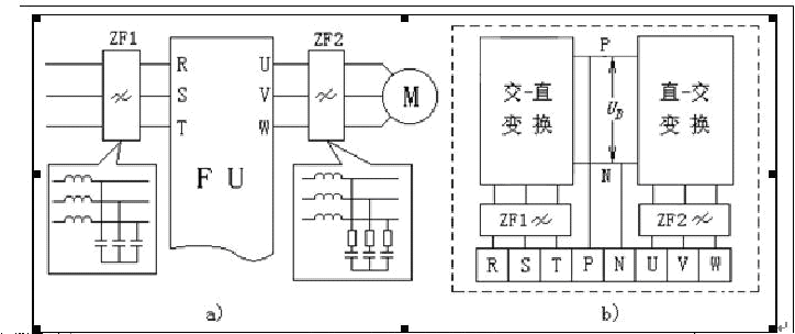 (3)接入滤波器:滤波器主要用于抑制具有辐射能力频率很高谐波电流,串变频器输入和输出电路中,如图2所示。滤波器由高频线圈和电容器组成。必须注意是:变频器输出侧滤波器中,其电容器只能接电动机侧,且应串入电阻,止逆变管因电容器充、放电而受到冲击。