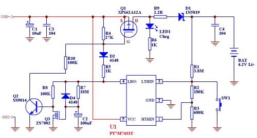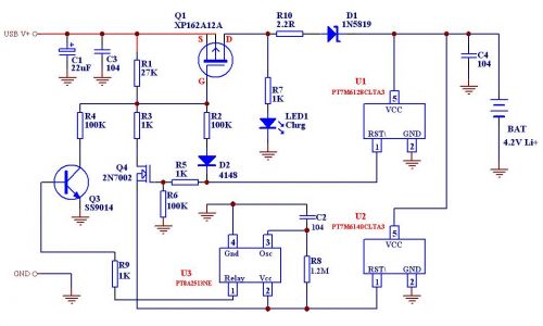 PT7M7433T是上海百利通公司最新设计的极高精度的一系列电压检测器的其中一款,其检测精度在0-Vcc (5.5V)范围内小于1mV,而且其批量IC的检测值偏差<±2.5%,这样完全保证了批量产品的性能一致性和极高的总体性能,我们利用其配合少量外部电路即可组成相当简单的锂电池充电线路。