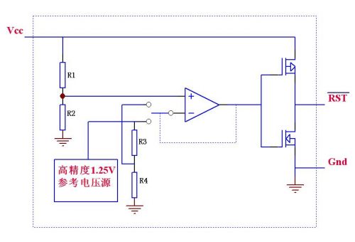 (图四)是U1/U2的内部框图,这两个IC只是内部电阻R1/R2的数值不同而已,它们的功能也很简单:当Vcc低于IC的设定值时(根据IC编号不同,内部R3/R4阻值也不同从而导致检测电压值不同,对于PT7M6128指的是2.80V),RST\引脚输出低电平,反之当Vcc 高于1.05倍标称值时(例如对于PT7M6140,此数值为1.05x4.0 =4.20V)则RST\引脚输出高电平。