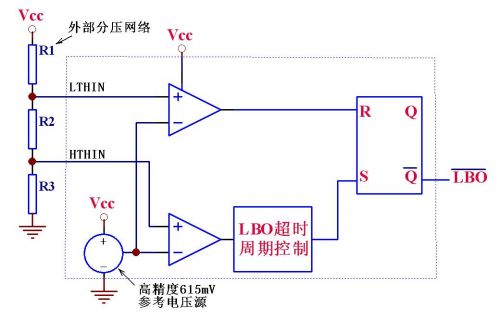 IC内含一个高精度的615mV基准电压源、两个比较器、一个RS触发器和其它一些逻辑电路,其大致功能是:VCC电压或其它待检测电压通过R1-R3组成的分压网络接在IC的LTHIN /HTHIN检测引脚,当待测电压下降导致LTHIN引脚低于615mV时,输出脚LBO\输出低电平,而如果待测电压上升导致HTHIN引脚高于615 mV时,经过内部逻辑判断和简单延时后,输出脚LBO\输出高电平。