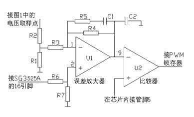 如图6所示,运放U2及外围电阻构成反比例放大器,运放U3及外围电路构成比较器图1中的R3为取样电阻,取2.2Ω,2W当负载电流增大时,该电阻的压降△U增大。