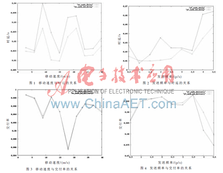 在上述两种场景下,数据分组的交付率、端到端时延与节点的移动速度、数据分组的发送频率之间的关系如图1~如图4所示。