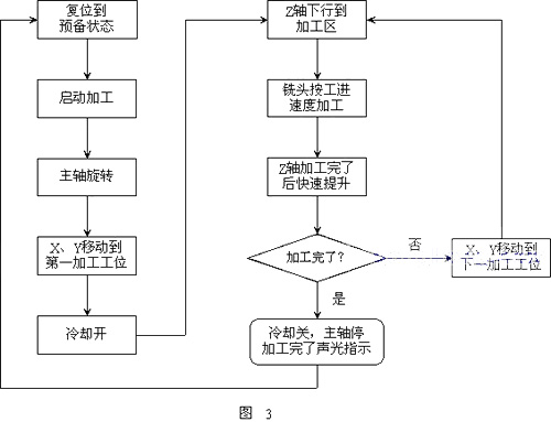 工件的加工流程图如图3所示,以Q7产品为例,胎具上一次装夹15只工件,那么就有30个φ3.7的平底盲孔需要加工,刀具选用φ3.7的2刃钨钢立铣刀,钻削加工,钻削深度1.65mm。在预备状态时紧靠工作台上的定位固定好胎具,按启动后,主轴旋转,待主轴即将达到额定转速时,X、Y轴同时运转到第一加工工位,也就是第一个孔的X、Y工件坐标值,此时冷却液打开、Z轴快速下降到加工区,即铣刀端面即将触及工件加工面,迅速变用缓慢的工进速度开始钻削加工。当加工深度到达设定深度(1.65mm)时,Z轴带动铣刀迅速抬起,抬起的高度为铣刀端面水平方向上碰触不到工件及胎具为准。计数器加1后程序进行比较运算,判断加工是否完了,如否,则X、Y轴继续运转到下一加工工位,再重复Z轴下降加工动作。如加工完了,产量计数器加数、主轴停转、冷却液关闭,同时发出5s声光报讯,用以提醒操作者,各轴移动到初始位:Z轴到上端;X轴到左端;Y轴到外端。卸下胎具后,一个加工周期完成,装上胎具再按启动即开始进行下一轮加工。