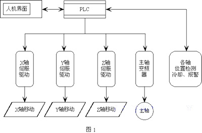 控制部分采用PLC,并配以人机界面进行程序参数修改、设定,以及运行状态显示监控,可编程设置人机界面的内容。三轴均为全数字交流伺服系统,各轴伺服电机通过连轴器带动滚珠丝杠,以移动配有直线导轨的工作台和主轴铣头,其定位准确,速度快。主轴铣头由变频器控制,根据刀具及工件和进给量,来设置主轴合理的转速,并在程序中设定它的启动停止。各轴均设二端极限传感器和原点传感器,冷却和润滑也都有异常检测,在报警灯和人机界面处显示报警信息。为便于调试和检修,各项操作均设手动功能,如手动各轴快慢移动、主轴高低速旋转、切削液及润滑开关等。此机床整体虽为半闭环控制,只要选件、装配、程序编制及操作合理,精度和稳定性还是能满足使用要求的。