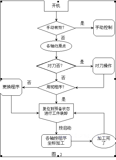 开机后先检测手动开关是否有效,若手动开关有效即利用各手动控制开关执行手动操作的项目。若手动开关无效,则启动原点复归程序,各轴进行机床原点复归,先回Z轴再回其它两轴,当所有轴都原点复归成功后才能进行到下一步。若刀具和工装夹具、工件程序均没有变动,可复位到加工预备状态而不进行对刀,若需对刀,则打开对刀开关启动对刀程序,3轴分别对刀,即找工件原点,利用手动各轴移动开关快慢移动各轴,使工件的三个面分别碰触低速旋转的刀具,刚好碰上为止。对好后,按对刀OK确认,再输入刀补,经过程序处理,即形成工件原点也就是编程0点,编程时根据此0点按照图纸计算刀具路径,可使操作者思路清晰,编辑运算简单。操作者编辑的是用户程序,可以编辑刀具轨迹,就是各轴移动坐标,还有移动速度、循环加工时的循环次数等。编好程序后或使用当前程序时,即复位到预备状态:各轴移动到初始位—一个合适的位置,装卸工件方便、不易碰触刀具时,装上工件,按启动即可开始加工,主轴运转,冷却液开,各轴按程序设定坐标移动。当加工结束时,机床复位,即各轴又移动到初始位,主轴停,冷却关,这时可卸下工件,完成加工过程。