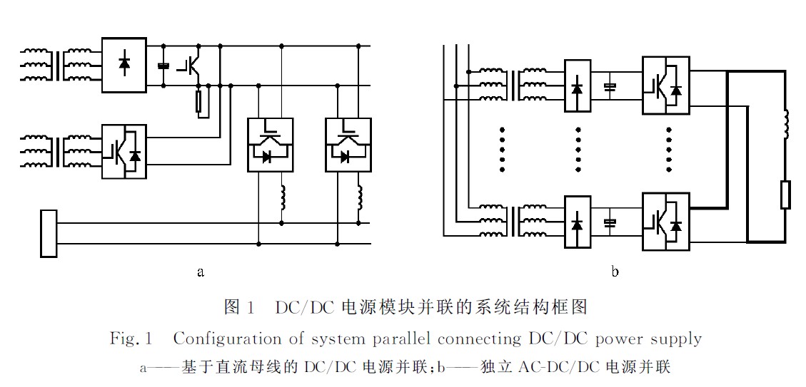 DC/DC电源并联有两种拓扑结构,一种是采用输入直流母线结构,其系统结构框图如图1a所示,主要包括整流变压器和不可控二极管整流电路,N 路DC/DC变换器,泵升电压抑制电路等;另一种是采用独立的AC-DC/DC电源并联,系统结构图如图1b所示。