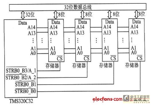 设计为32位的存储器,其硬件接线方案如下图4所示。STRBx所有的引脚都设置成片选引脚。