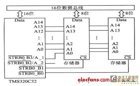 在16位存储器中存放32位数据时,STRB0_B3/A1作为地址引脚与外部存储器的AO相接,STRB0_B0和STRB0_B1作为片选信号,STRBx_B2/A_2不用。由于数据宽度大于存储器宽度,所以在外部存储器偶地址中存放32位数据的低16位,奇地址中存放32位数据的高16位,外部存储器的地址为OH~lFFFFH,对应的在C32存储映射中的地址为OH~0FFFFH。当一条指令向逻辑地址OH中装入一个32位数据时,存储器接口必须向外部16位存储器执行两个指令周期。这两个指令周期访问2个连续的外部存储器地址OH和1H,从而完成对32位数据的操作。