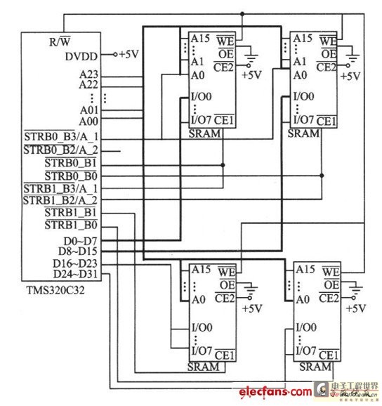 图8给出了一个实际TMS320C32存储嚣接口的电路图。16位存储器由2片128 K8位的SRAM构成,32位存储器由4片128 K8位的SRAM构成,STRB0的4组选通信号接16位外部存储器,STRBl的4组选通信号接32位外部存储器。为说明数据在存储器及处理器中的存放格式,本文设计了两种存储器接口电路:一是在16位存储器中存放32位数据;二是在32位存储器中存放32位数据。