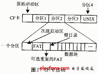 CF卡跟硬盘的结构相同,如图2所示。在引导区中装有用于启动系统的代码,以及有关文件系统的重要信息,随后是记录所有磁盘空间的表,再下来就是根目录,然后是所有其它的东西。引导扇区在其末尾处包含有分区表。此表包含了用以标示每个分区开始和结束的表项,最多可以有四个分区,每个分区可包含不同的文件系统。紧随引导区之后的是FAT(文件分配表),用来记录设备中所有的磁盘空间的信息(此表与UNIX中的I-Node表和空闲表具有相同的功能)。