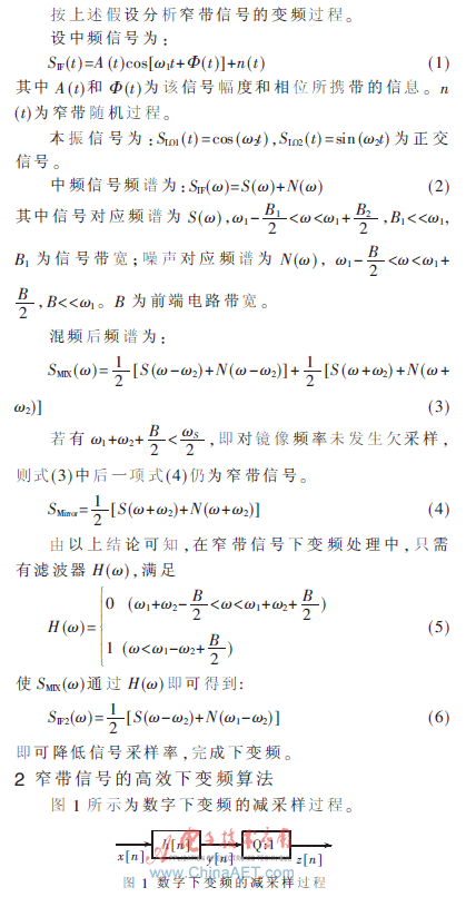 目前微纳卫星通信系统中常见的无线通信模式,例如GSM、WCDMA、TD-SCDMA,虽然有些已经使用了扩频通信模式,但是相对数十MHz的中频频率而言,其带宽仍然可以作为窄带信号(信号通频带远远小于信号中心频率)处理。以下论述中作如下假设:在信号采样之前,预先经窄带滤波器处理;采样后的噪声与有用信号均为窄带信号。