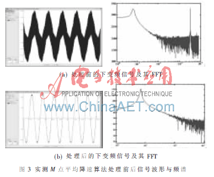 对M点平均降速算法的滤波性能进行测试。测试方案为:在virtex 4系列XC4VSX35 FPGA芯片中编程实现2个NCO:NCO1、NCO2,NCO1输出信号的频率为1.5 MHz,NCO2的输出频率比NCO1低5 000 Hz;将NCO1、NCO2输出的信号混频(相乘),相乘之后通过10点平均降速模块完成下变频,下变频输出的信号为5 000 Hz,采样率为1.5 MHz。实测处理前后信号如图3所示。