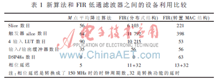 在Xilinx ISE 10.1环境中编程实现M点平均降速算法。设M=10,输入数据位宽为16 bit,使用XST综合器综合得到RTL实现结构。设定滤波器输入位宽为16 bit,阻带抑制为26 dB,阻带为1/20采样率,通带为1/30采样率,可在ISE中调用FIR滤波器的IP核产生。这个算法和FIR “器件利用小结”相比较如表1所示。可见“M点平均降速算法”在FPGA中实现的资源消耗量远远小于FIR滤波器。同时,该算法相位延迟比通常算法减少约80%。