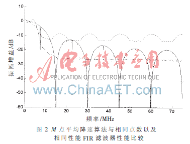 与FIR滤波器相比,M点平均降速算法具有优势。设M=10,采样率为150 MS/s,对15 MHz、30 MHz、45 MHz、60 MHz陷波点处,依次对带宽1.49 MHz、 2.90MHz、 4.02 MHz、4.83 MHz内的窄带信号具有大于26 dB的抑制能力,如图2中实线,延迟时间为5个采样周期;如采用等纹波方式逼近的FIR滤波器,则需要85点才能达到26 dB的抑制能力,如图2中虚线,延迟时间为43个采样周期;而10点的FIR滤波器只有大约13 dB的抑制能力,如图2点线。可以得到结论:M点平均降速算法对窄带信号达到相同抑制能力比相同性能的FIR滤波器需要的点数少,延迟时间短;比相同点数的FIR滤波器对窄带信号的抑制能力强。
