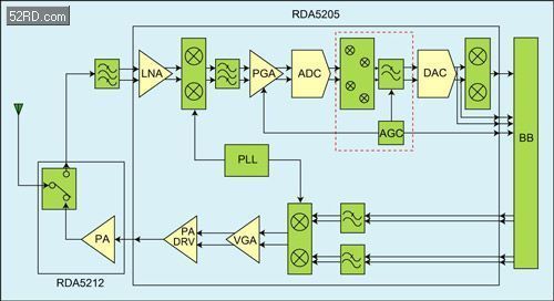 锐迪科微电子PHS手机射频前端主要组成部分如下: