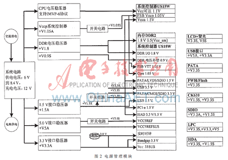 本文系统包括了处理器、桥片、内存、硬盘、触摸屏、LCD、PCI-e、SDIO、USB以及其他各种数字和模拟电路等,这些功能模块对电源的要求各不相同。为使这些功能模块正常工作并实现功耗最小化以达到更长的电池使用时间,针对各个功能模块的精细化需求,同时考虑到电源变换效率,设计了介于0.9 V~5 V之间的近20组电源,如图2所示。