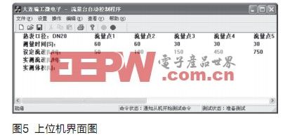 上位机软件采用MFC(微软的基础类库)的编程方法,充分利用了面向对象技术的优点,MFC类库中各种对象的强大功能足以完成程序中大部分所需要的功能。软件操作界面如图5所示。通过界面中的设置选项可以设定标定的流量点个数、流量点流速和不同流量点的具体标定时间。