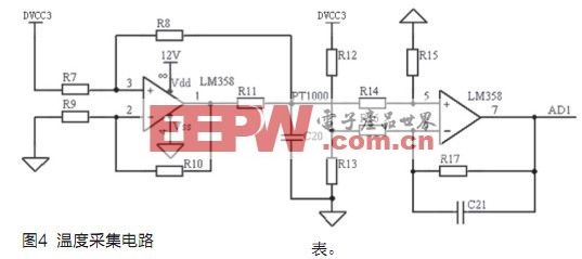 为实现恒温水箱的温度控制需要采集恒温水箱的温度。采用铂电阻PT1000温度传感器测量水温。本系统温度采集电路采样恒流驱动模式,如图4所示。为避免PT1000传感器长期工作的情况下自热而影响到测温精度,设计恒流源的输出电流在5mA以内。图4中左边的运放组成恒流源电路。右边的运放组成差分放大器以增加共模抑制比,电压放大倍数为R17/R16(其中R15=R17,R14=R16)。