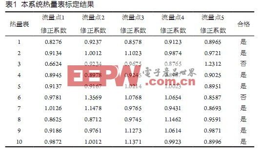 采用本系统对大连瑞工微电子公司生产的热量表进行了标定。根据中华人民共和国国家计量检定规程规定,检定的5个流量点q1-q5的选择应为:qmin≤q1≤1.1qmin,0.1qp≤q2≤0.11qp,0.3qp≤q3≤0.31qp,0.9qp≤q4≤1.0qp,0.9qmax≤q5≤1.0qmax,其中qmin为热量表流量测量下限,qp为热量表标称流量,qmax为热量表流量测量上限。表1为本系统在大连瑞工微电子生产现场随机抽取的10块热量表的标定结果。根据国家计量检定规程规定,III级热量表的精度为3%。现场标定中,取相邻流量点修正系数超过3%视为不合格。热量表3在流量点4和5的修正系数不满足要求,热量表6在流量点1和2的修正系数不满足要求,其余热量表均合格。