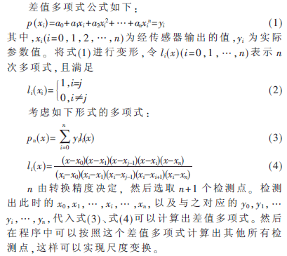 尺度变换有软件实现法、硬件实现法、实物定标法和综合实现法四种方法[7]。由于硬件实现法费用高且占用线路板面积,因此不采用。综合考虑价格、实现的难易以及信号转变的精度等因素,选择了软件实现法中的多项式变换公式法。这是一种最简单实用的方法,适用于绝大多数场合。