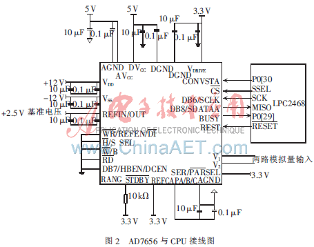 在水质监测装置中,为了达到测量精度,采用了ADI公司16 bit、6通道、高集成度逐次逼近型同步采样ADC。AD7656采用iCMOS工艺,功耗比最接近的同类双极型ADC降低了60%,采样率每通道达250 kb/s,并且在片内包含一个+2.5 V内部基准电压源和缓冲器,因此能很好地满足电能质量装置对高分辨率、多通道、高转换速率和低功耗的要求。AD7656接口电路如图2所示。图中V1~V6为6路经信号调节电路处理的模拟信号,通过低通滤波器滤除高频分量。VDD与VSS为采样保持开关工作的电源,为保证AD7656正常工作,需保证VDD和VSS大于模拟输入电压范围,这里取-12 V~+12 V。AVcc与DVcc是AD7656模拟电压输入端和数字电压输入端。系统提供+5 V给AVcc模拟电压端,然后将DVcc和AVcc连接在一起,AVcc与DVcc通过磁珠隔离,以减少工作过程中DVcc引起的数字噪声对AVcc的影响。由于对实时性要求不高,因此A/D转换器与LPC2468之间采取SPI通信,大大简化了硬件接线。
