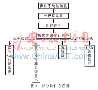 软件部分采用源码公开的嵌入式操作系统μC/OS-II作为软件平台,其具有易移植、可靠、稳定等特点,并可编写文件管理系统和相关的通信协议栈[3]。主要流程包括系统初始化和系统任务编写两大部分,如图4所示。系统初始化包括μC/OS-II操作系统初始化与系统外设初始化。操作系统初始化包括操作系统启动代码、任务函数的定义和初始化、文件系统及相关协议栈的安装;系统外设初始化包括定时器初始化、SPI和串口控制器初始化等。该系统共有4个任务,根据其轻重缓急分配了任务优先级和任务堆栈的大小。安装的协议栈包括USB协议栈和TCP/IP协议栈[4]。