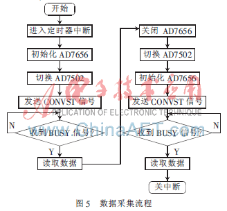 进入定时器中断,初始化AD7656,软件延时产生一定频率的CONVST采样信号,用来启动AD7656的数据转换[5],等待BUSY信号。在接收到BUSY信号后读取数据,采样完成,关闭定时器中断。图5为采样流程图。