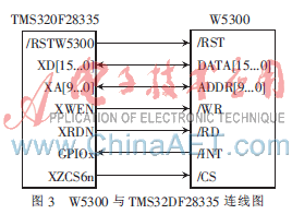 将W5300配置为16 bit数据总线宽度,选择内部以太网PHY,选择以太网自动握手模式。W5300与主机接口模式采用直接地址模式。F28335与W5300之间连线有16 bit的数据线和10 bit地址线,以及/WR、/RD、/CS、 /INT、/RST控制线。初始化硬件时,W5300的各个寄存器和地址映射到F28335的zone6区。TMS320F28335与W5300的硬件接口如图3所示。