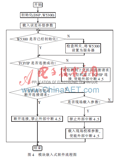 模块的嵌入式程序存储在主控制芯片F28335中。为了能够与主控板实时交换数据,通过1 kHz同步时钟的上升沿和下降沿触发外部中断4、5。为了避免W5300产生的外部中断与外部中断4、5冲突,将F28335获取W5300状态的方式设为查询端口状态寄存器的方式,运行外部中断4中断服务程序时进行查询。外部中断4的服务程序包含与主控板的数据通信以及与上位机的TCP/IP网络通信;外部中断5的中断服务程序包含对跟踪头测得数据的误差补偿和协助跟踪头实现断光续接功能。在程序初始化部分载入EEPROM中的误差补偿参数。在程序运行中,若检测到上位机载入现场校准参数的命令,则禁止外部中断4、5,将从上位机读入的参数写入EEPROM中。嵌入式软件的流程图如图4所示。