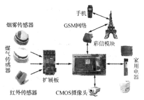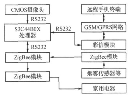 本系统采用模块化设计方案。以嵌入式系统主板为核心,通过CMOS摄像头对关键部位进行安全监测,通过手机传递安全信息和图像彩信,并对家用电器进行远程控制,利用ZigBee模块实现家用电器、系统主板和烟雾、温度、煤气等传感器的无线联网。