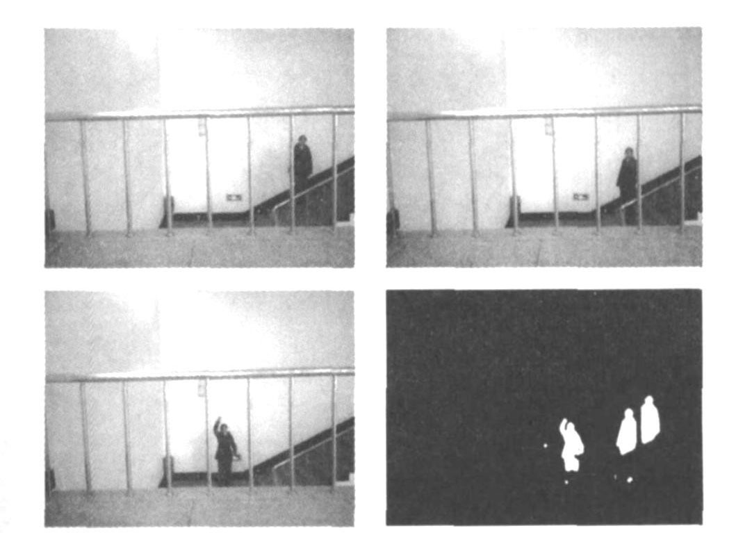 本系统采用运动目标检测算法,实现对监视对象的图像处理与异常判断,占背景面积8‰的小目标都能被系统识别。系统有效消除了因环境光线变化、背景微变、小目标渐进运动等因素引起的系统误判。采用本系统软、硬件进行入侵事件检测,其实验图片及检测效果如图5所示。