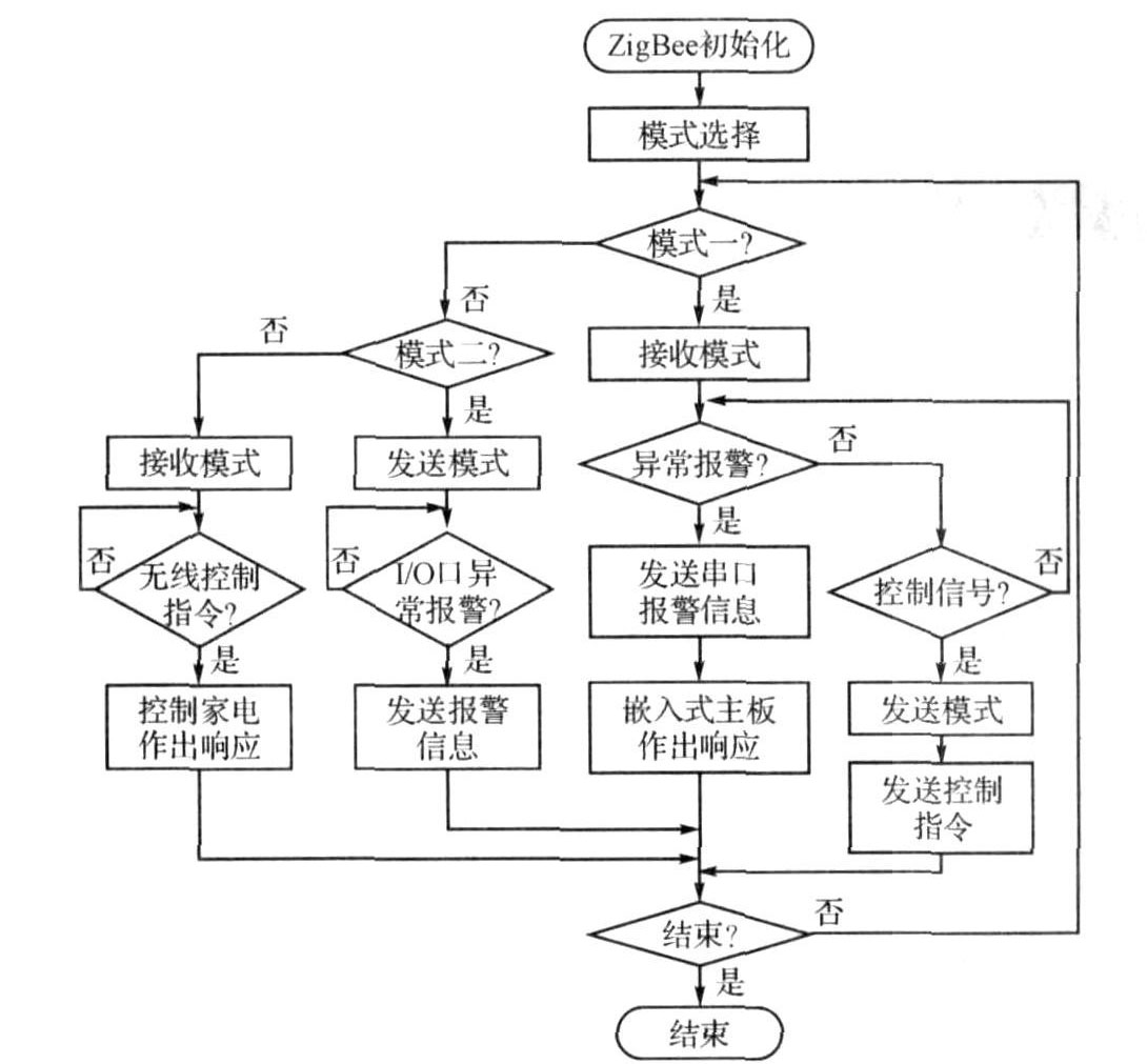 模式1.与系统主板相连。用来接收其他ZigBee模块发送的报警信息和将主板给出的控制信息发送给其他ZigBee模块,是主板与外部设备进行无线通信的核心枢纽。