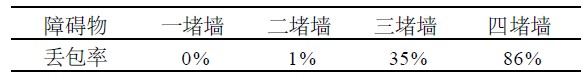 ②数据传输距离为30 m时,随着障碍物增加而产生的丢包率;实验数据分别如表1、表2所示。