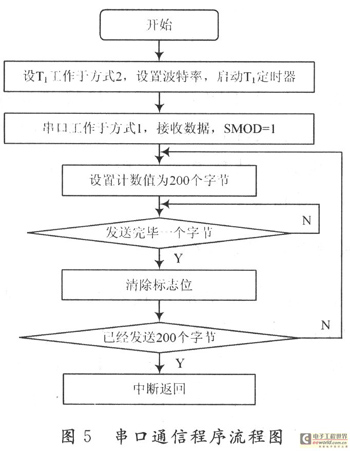 串口通信部分通过AT89C51内部的全双工串行通信接口RXD和TXD进行发送和接收。AT89C51串行接口有四种工作模式,本设计中,串口工作于方式1,波特率可变,通过定时器T1进行溢出率控制,令T1工作于方式2,由于波特率为(2SMOD/32)·(fOSC/12)·[1/(28- TH1)],则通过计算可得T1装载值为0xFA,波特率为9 600 b/s。这里选用MAX232完成TTL到EIA的电平转换。