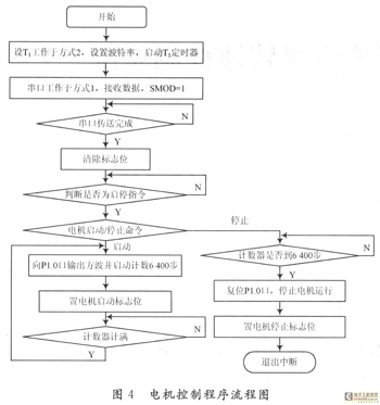 电机运行控制部分通过中断接收串口命令,以实现电机的精确启动和停止,从而控制天线的扫描状态,当串口发送5500h时电机停止;当发送55ffh时电机启动。其重点在于精确读取天线的转角状态,保证电机启动和停止处于同一位置。主要通过软件计数来实现,由于电机步进角为1.8°且采用32细分,则每转一圈步数为:360°/(1.8°/32)=6 400步,通过读取计数值,实现对电机启动停止位置的控制。电机控制部分程序流程图如图4所示。
