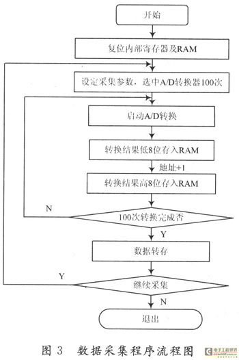 数据采集部分包括初始化、信号采集及存储,采集速率通过编程进行控制,实现每10 ms采样一个电压值,并存人0100H~01C8H的地址空间中,采集100个数据后调用中断通过串口传给上位机进行后续处理。每次系统上电时,采集部分复位并从头运行,数据采集部分程序流程图如图3所示。