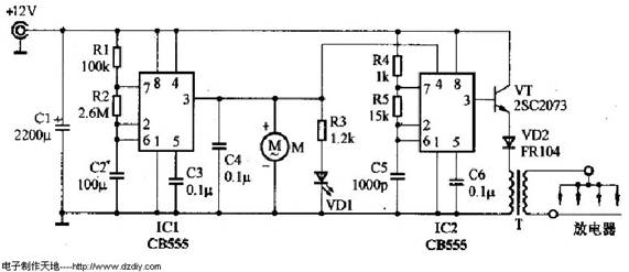 IC1、IC2选用两块时基电路CB555,或选用一块双时基电路CB556。注意,CMOS时基电路CB7555或CB7556因驱动电流较小,不适合本机使用。开关管VT选用2SC2073等中功率管。二极管VD2选用FR104等快恢复整流管。风扇M可选用12V、150mA左右的计算机CPU用的散热风扇,其体积较小、厚度薄、噪声很低,比较适合本制作使用,也可用12V玩具电机配以自制的风扇叶片代用。