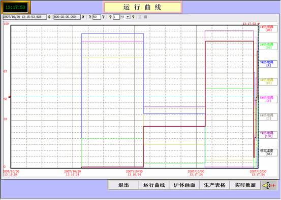 可以根据工艺要求设定工艺曲线,并将所有设定曲线的方案进行存储,并且可以修改和删除。操作人员只需选择工艺曲线的名称,进入系统就可以自动完成整个工艺过程。在工作的工程中,可以对生产过程中的各个参数进行监控,包括运行曲线、炉体监控、生产表格和实时数据,还可以查询生产过程中的历史数据和曲线。