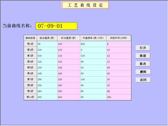 6 工艺曲线的设定利用紫金桥的自由报表可以很容易的实现工艺曲线的新建、修改和删除。用户只需填入第一段曲线的起点温度、重点温度和温升速率,系统就会自动计算出本段曲线所需要的时间,而且第二段曲线的起点温度自动为上一段的终点温度,使曲线的设定更加方便,减少了错误的发生。