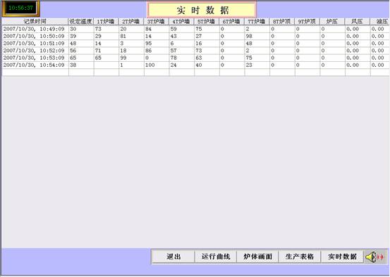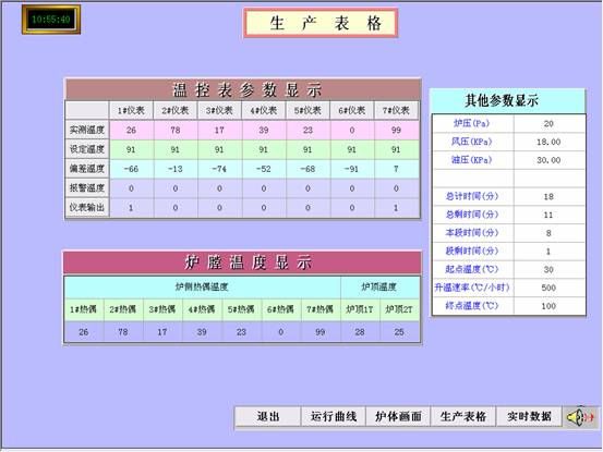4 生产表格通过生产报表可以清晰地看到每个仪表的实时温度、设定温度、仪表的输出温度、炉膛各个部分的温度、炉压风压和油压以及实时温度与设定温度的差值。还能自动计算出本段工艺所需要的总时间、总剩余时间以及本段所需要的时间、剩余时间、温升速率、起点和终点的温度,随时更改报警温度,以便操作人员控制整个生产过程。